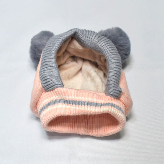 Kids Beanie PomPom Wool Cap With Attached Neck Warmer - Pink